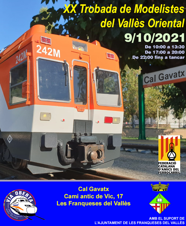 El Centre d’Estudis Ferroviaris Via Oberta us convida a la 20a Trobada de Modelistes del Vallès Oriental que tindrà lloc el dissabte 9 d’octubre de 2021 al seu circuit permanent de 5″ i 7¼” de Cal Gavatx, a les Franqueses del Vallès.