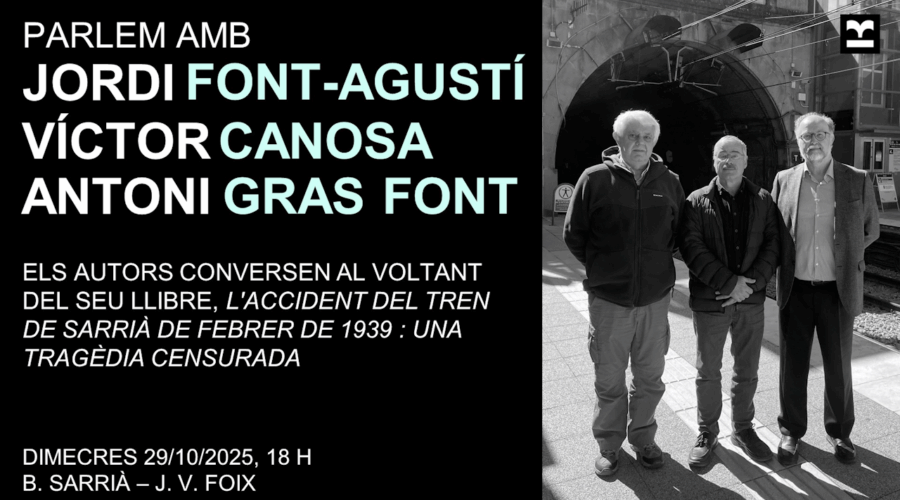 El proper dimecres 29 d’octubre de 2025 es realitzarà a la biblioteca J. V. Foix de Sarrià la presentació del llibre “L’accident del tren de Sarrià de febrer del 1939. Una tragèdia censurada” de Jordi Font-Agustí, Victor Canosa i Antoni Gras.