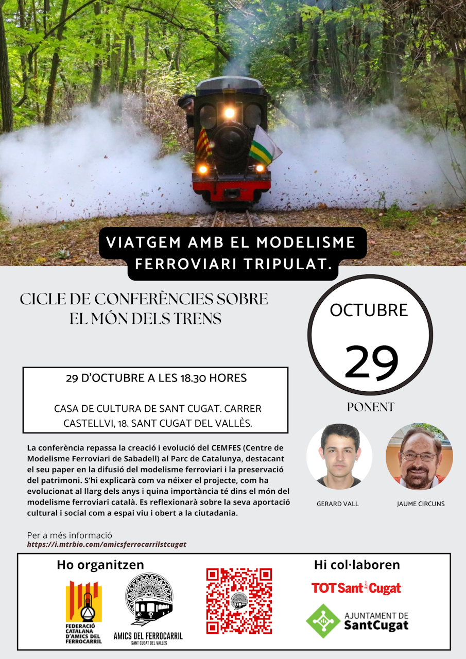 El proper dimecres 29 d’octubre de 2025 a les 18:30 hores es durà a terme una conferència amb el títol “Viatgem amb el Modelisme Ferroviari Tripulat”, a càrrec de Gerard Vall i Jaume Circuns, organitzada per l’Associació d’Amics del Ferrocarril de Sant Cugat del Vallès conjuntament amb la FCAF.