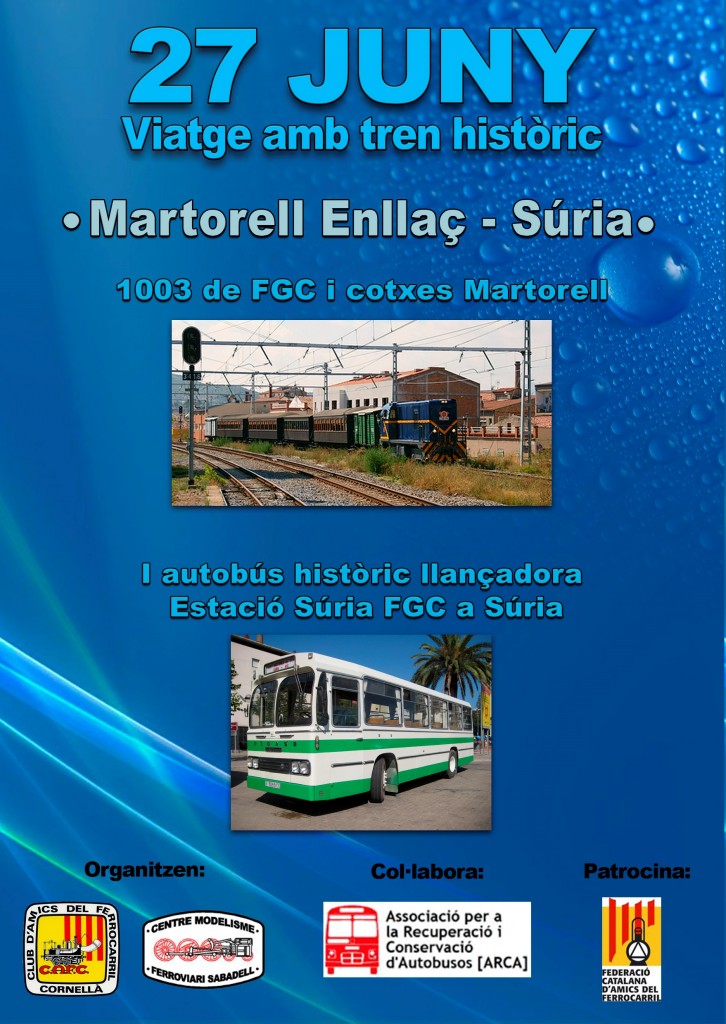El Club d’Amics del Ferrocarril de Cornellà i el Centre Modelisme Ferroviari Sabadell organitzen conjuntament un viatge el 27 de juny de 2015 amb la locomotora dièsel 1003 i els Cotxes “C” (cotxes de fusta o Martorells) de Martorell a Súria.